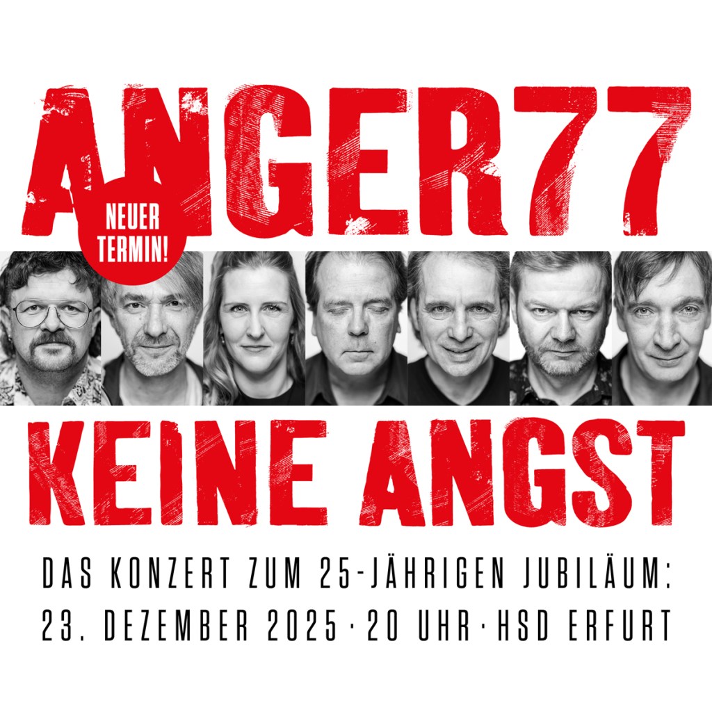 Zum 25-jährigen Jubiläum zelebrieren ANGER77 ihren Meilenstein KEINE ANGST exklusiv mit ihrer aktuellen 7-köpfigen Besetzung. Von LEBEN über HELFT bis ANGST erklingen alle Lieder in Originalreihenfolge in der stimmungsvollen Atmosphäre des HSD.