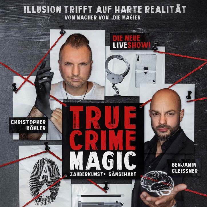 Die beiden renommierten Magier Christopher Köhler und Benjamin Gleissner stehen im Zentrum dieser einzigartigen Show. Christopher Köhler, der Macher der Erfolgsshow „Die Magier“, kehrt mit einem neuen Konzept zurück um Ihnen eine ganz neue Seite der Magie zu präsentieren. Benjamin Gleissner kennt sich mit wahren Verbrechen aus, denn außerhalb der Bühne ist er Polizist und bringt seine Expertise mit in die Kunst ein. Mit ihrer beeindruckenden Kombination aus kriminalistischer Schärfe und zauberhafter Geschicklichkeit bringen sie Geschichten zum Leben, die das Publikum in Atem halten. Ihre Darbietungen sind so real, dass Sie kaum glauben werden, was vor Ihren Augen geschieht.