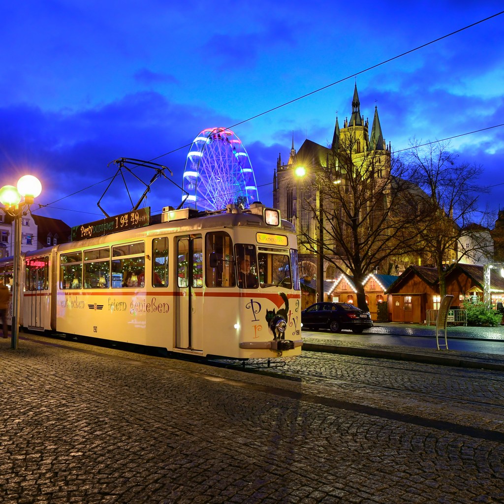 Gönne Dir eine Pause von der hektischen Adventszeit und genieße das weihnachtlich geschmückte Erfurt gemütlich im Katerexpress. Ob als entspannte Pause zum Verweilen zwischendurch, träumerisch für kleine Märchenfans oder mit Anekdoten eines Erfurter Stadtführers – finde die passende Tour und genieße zur Einstimmung einen Glühwein oder Kinderpunsch während der Fahrt. Der Katerexpress rollt an vielen Terminen während der Zeit des Erfurter Weihnachtsmarktes.